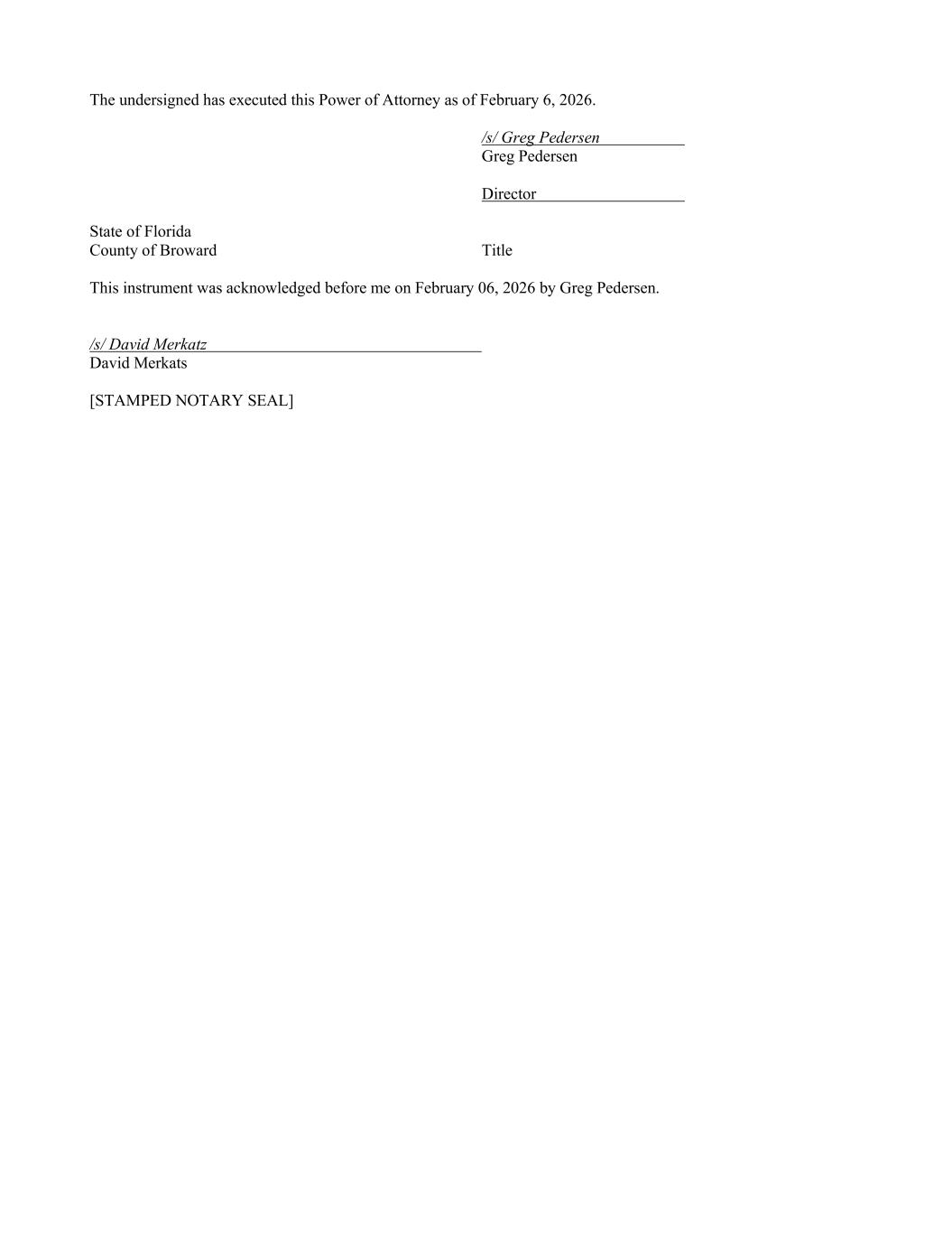 The undersigned has executed this Power of Attorney as of February 6, 2026. /s/ Greg Pedersen Greg Pedersen Director State of Florida County of Broward Title This instrument was acknowledged before me on February 06, 2026 by Greg Pedersen. /s/ David Merkatz David Merkats [STAMPED NOTARY SEAL]