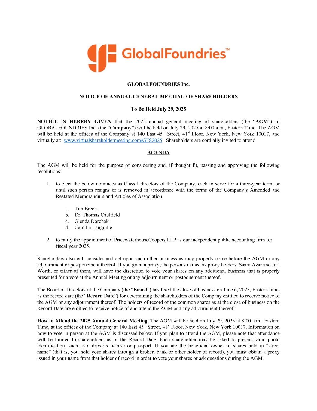 GLOBALFOUNDRIES Inc. NOTICE OF ANNUAL GENERAL MEETING OF SHAREHOLDERS To Be Held July 29, 2025 NOTICE IS HEREBY GIVEN that the 2025 annual general meeting of shareholders (the “AGM”) of GLOBALFOUNDRIES Inc. (the “Company”) will be held on July 29, 2025 at 8:00 a.m., Eastern Time. The AGM will be held at the offices of the Company at 140 East 45th Street, 41st Floor, New York, New York 10017, and virtually at: www.virtualshareholdermeeting.com/GFS2025. Shareholders are cordially invited to attend. AGENDA The AGM will be held for the purpose of considering and, if thought fit, passing and approving the following resolutions: 1. to elect the below nominees as Class I directors of the Company, each to serve for a three-year term, or until such person resigns or is removed in accordance with the terms of the Company’s Amended and Restated Memorandum and Articles of Association: a. Tim Breen b. Dr. Thomas Caulfield c. Glenda Dorchak d. Camilla Languille 2. to ratify the appointment of PricewaterhouseCoopers LLP as our independent public accounting firm for fiscal year 2025. Shareholders also will consider and act upon such other business as may properly come before the AGM or any adjournment or postponement thereof. If you grant a proxy, the persons named as proxy holders, Saam Azar and Jeff Worth, or either of them, will have the discretion to vote your shares on any additional business that is properly presented for a vote at the Annual Meeting or any adjournment or postponement thereof. The Board of Directors of the Company (the “Board”) has fixed the close of business on June 6, 2025, Eastern time, as the record date (the “Record Date”) for determining the shareholders of the Company entitled to receive notice of the AGM or any adjournment thereof. The holders of record of the common shares as at the close of business on the Record Date are entitled to receive notice of and attend the AGM and any adjournment thereof. How to Attend the 2025 Annual General Meeting: The AGM will be held on July 29, 2025 at 8:00 a.m., Eastern Time, at the offices of the Company at 140 East 45th Street, 41st Floor, New York, New York 10017. Information on how to vote in person at the AGM is discussed below. If you plan to attend the AGM, please note that attendance will be limited to shareholders as of the Record Date. Each shareholder may be asked to present valid photo identification, such as a driver’s license or passport. If you are the beneficial owner of shares held in “street name” (that is, you hold your shares through a broker, bank or other holder of record), you must obtain a proxy issued in your name from that holder of record in order to vote your shares or ask questions during the AGM.