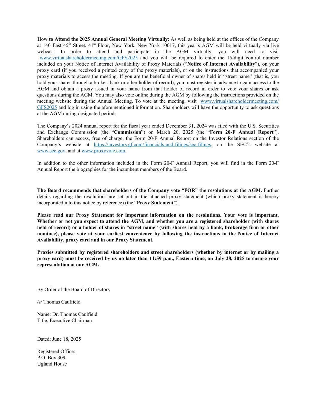 How to Attend the 2025 Annual General Meeting Virtually: As well as being held at the offices of the Company at 140 East 45th Street, 41st Floor, New York, New York 10017, this year’s AGM will be held virtually via live webcast. In order to attend and participate in the AGM virtually, you will need to visit www.virtualshareholdermeeting.com/GFS2025 and you will be required to enter the 15-digit control number included on your Notice of Internet Availability of Proxy Materials (“Notice of Internet Availability”), on your proxy card (if you received a printed copy of the proxy materials), or on the instructions that accompanied your proxy materials to access the meeting. If you are the beneficial owner of shares held in “street name” (that is, you hold your shares through a broker, bank or other holder of record), you must register in advance to gain access to the AGM and obtain a proxy issued in your name from that holder of record in order to vote your shares or ask questions during the AGM. You may also vote online during the AGM by following the instructions provided on the meeting website during the Annual Meeting. To vote at the meeting, visit www.virtualshareholdermeeting.com/ GFS2025 and log in using the aforementioned information. Shareholders will have the opportunity to ask questions at the AGM during designated periods. The Company’s 2024 annual report for the fiscal year ended December 31, 2024 was filed with the U.S. Securities and Exchange Commission (the “Commission”) on March 20, 2025 (the “Form 20-F Annual Report”). Shareholders can access, free of charge, the Form 20-F Annual Report on the Investor Relations section of the Company’s website at https://investors.gf.com/financials-and-filings/sec-filings, on the SEC’s website at www.sec.gov, and at www.proxyvote.com. In addition to the other information included in the Form 20-F Annual Report, you will find in the Form 20-F Annual Report the biographies for the incumbent members of the Board. The Board recommends that shareholders of the Company vote “FOR” the resolutions at the AGM. Further details regarding the resolutions are set out in the attached proxy statement (which proxy statement is hereby incorporated into this notice by reference) (the “Proxy Statement”). Please read our Proxy Statement for important information on the resolutions. Your vote is important. Whether or not you expect to attend the AGM, and whether you are a registered shareholder (with shares held of record) or a holder of shares in “street name” (with shares held by a bank, brokerage firm or other nominee), please vote at your earliest convenience by following the instructions in the Notice of Internet Availability, proxy card and in our Proxy Statement. Proxies submitted by registered shareholders and street shareholders (whether by internet or by mailing a proxy card) must be received by us no later than 11:59 p.m., Eastern time, on July 28, 2025 to ensure your representation at our AGM. By Order of the Board of Directors /s/ Thomas Caulfield Name: Dr. Thomas Caulfield Title: Executive Chairman Dated: June 18, 2025 Registered Office: P.O. Box 309 Ugland House