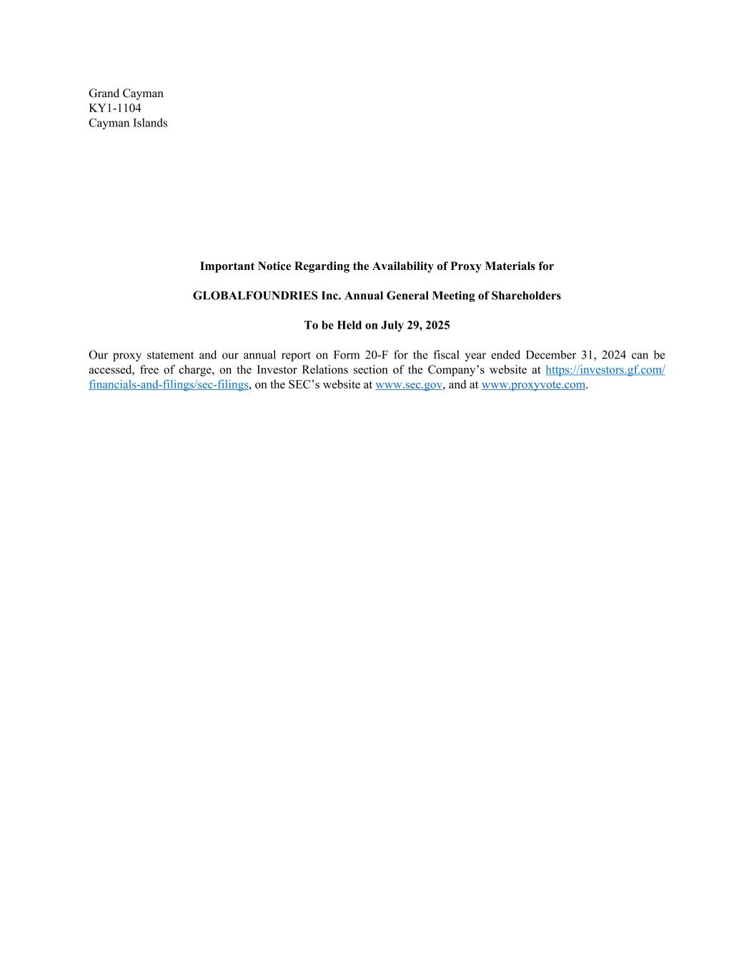 Grand Cayman KY1-1104 Cayman Islands Important Notice Regarding the Availability of Proxy Materials for GLOBALFOUNDRIES Inc. Annual General Meeting of Shareholders To be Held on July 29, 2025 Our proxy statement and our annual report on Form 20-F for the fiscal year ended December 31, 2024 can be accessed, free of charge, on the Investor Relations section of the Company’s website at https://investors.gf.com/ financials-and-filings/sec-filings, on the SEC’s website at www.sec.gov, and at www.proxyvote.com.