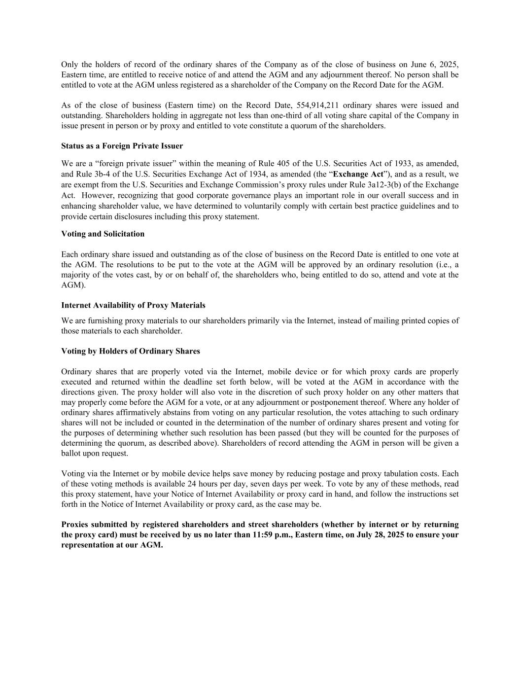 Only the holders of record of the ordinary shares of the Company as of the close of business on June 6, 2025, Eastern time, are entitled to receive notice of and attend the AGM and any adjournment thereof. No person shall be entitled to vote at the AGM unless registered as a shareholder of the Company on the Record Date for the AGM. As of the close of business (Eastern time) on the Record Date, 554,914,211 ordinary shares were issued and outstanding. Shareholders holding in aggregate not less than one-third of all voting share capital of the Company in issue present in person or by proxy and entitled to vote constitute a quorum of the shareholders. Status as a Foreign Private Issuer We are a “foreign private issuer” within the meaning of Rule 405 of the U.S. Securities Act of 1933, as amended, and Rule 3b-4 of the U.S. Securities Exchange Act of 1934, as amended (the “Exchange Act”), and as a result, we are exempt from the U.S. Securities and Exchange Commission’s proxy rules under Rule 3a12-3(b) of the Exchange Act. However, recognizing that good corporate governance plays an important role in our overall success and in enhancing shareholder value, we have determined to voluntarily comply with certain best practice guidelines and to provide certain disclosures including this proxy statement. Voting and Solicitation Each ordinary share issued and outstanding as of the close of business on the Record Date is entitled to one vote at the AGM. The resolutions to be put to the vote at the AGM will be approved by an ordinary resolution (i.e., a majority of the votes cast, by or on behalf of, the shareholders who, being entitled to do so, attend and vote at the AGM). Internet Availability of Proxy Materials We are furnishing proxy materials to our shareholders primarily via the Internet, instead of mailing printed copies of those materials to each shareholder. Voting by Holders of Ordinary Shares Ordinary shares that are properly voted via the Internet, mobile device or for which proxy cards are properly executed and returned within the deadline set forth below, will be voted at the AGM in accordance with the directions given. The proxy holder will also vote in the discretion of such proxy holder on any other matters that may properly come before the AGM for a vote, or at any adjournment or postponement thereof. Where any holder of ordinary shares affirmatively abstains from voting on any particular resolution, the votes attaching to such ordinary shares will not be included or counted in the determination of the number of ordinary shares present and voting for the purposes of determining whether such resolution has been passed (but they will be counted for the purposes of determining the quorum, as described above). Shareholders of record attending the AGM in person will be given a ballot upon request. Voting via the Internet or by mobile device helps save money by reducing postage and proxy tabulation costs. Each of these voting methods is available 24 hours per day, seven days per week. To vote by any of these methods, read this proxy statement, have your Notice of Internet Availability or proxy card in hand, and follow the instructions set forth in the Notice of Internet Availability or proxy card, as the case may be. Proxies submitted by registered shareholders and street shareholders (whether by internet or by returning the proxy card) must be received by us no later than 11:59 p.m., Eastern time, on July 28, 2025 to ensure your representation at our AGM.