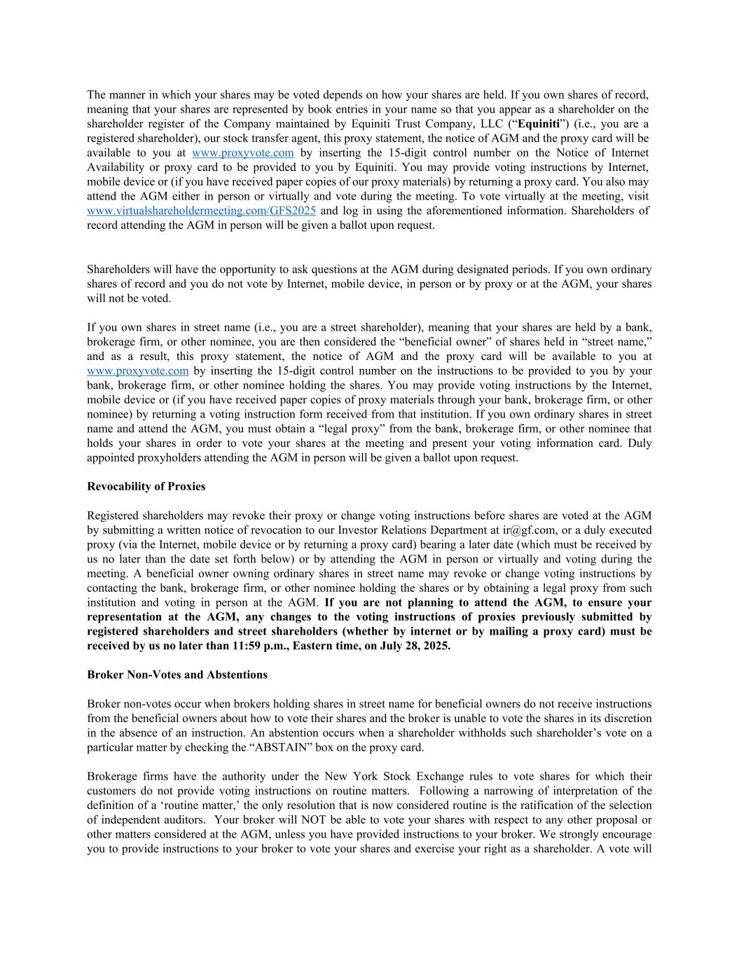 The manner in which your shares may be voted depends on how your shares are held. If you own shares of record, meaning that your shares are represented by book entries in your name so that you appear as a shareholder on the shareholder register of the Company maintained by Equiniti Trust Company, LLC (“Equiniti”) (i.e., you are a registered shareholder), our stock transfer agent, this proxy statement, the notice of AGM and the proxy card will be available to you at www.proxyvote.com by inserting the 15-digit control number on the Notice of Internet Availability or proxy card to be provided to you by Equiniti. You may provide voting instructions by Internet, mobile device or (if you have received paper copies of our proxy materials) by returning a proxy card. You also may attend the AGM either in person or virtually and vote during the meeting. To vote virtually at the meeting, visit www.virtualshareholdermeeting.com/GFS2025 and log in using the aforementioned information. Shareholders of record attending the AGM in person will be given a ballot upon request. Shareholders will have the opportunity to ask questions at the AGM during designated periods. If you own ordinary shares of record and you do not vote by Internet, mobile device, in person or by proxy or at the AGM, your shares will not be voted. If you own shares in street name (i.e., you are a street shareholder), meaning that your shares are held by a bank, brokerage firm, or other nominee, you are then considered the “beneficial owner” of shares held in “street name,” and as a result, this proxy statement, the notice of AGM and the proxy card will be available to you at www.proxyvote.com by inserting the 15-digit control number on the instructions to be provided to you by your bank, brokerage firm, or other nominee holding the shares. You may provide voting instructions by the Internet, mobile device or (if you have received paper copies of proxy materials through your bank, brokerage firm, or other nominee) by returning a voting instruction form received from that institution. If you own ordinary shares in street name and attend the AGM, you must obtain a “legal proxy” from the bank, brokerage firm, or other nominee that holds your shares in order to vote your shares at the meeting and present your voting information card. Duly appointed proxyholders attending the AGM in person will be given a ballot upon request. Revocability of Proxies Registered shareholders may revoke their proxy or change voting instructions before shares are voted at the AGM by submitting a written notice of revocation to our Investor Relations Department at ir@gf.com, or a duly executed proxy (via the Internet, mobile device or by returning a proxy card) bearing a later date (which must be received by us no later than the date set forth below) or by attending the AGM in person or virtually and voting during the meeting. A beneficial owner owning ordinary shares in street name may revoke or change voting instructions by contacting the bank, brokerage firm, or other nominee holding the shares or by obtaining a legal proxy from such institution and voting in person at the AGM. If you are not planning to attend the AGM, to ensure your representation at the AGM, any changes to the voting instructions of proxies previously submitted by registered shareholders and street shareholders (whether by internet or by mailing a proxy card) must be received by us no later than 11:59 p.m., Eastern time, on July 28, 2025. Broker Non-Votes and Abstentions Broker non-votes occur when brokers holding shares in street name for beneficial owners do not receive instructions from the beneficial owners about how to vote their shares and the broker is unable to vote the shares in its discretion in the absence of an instruction. An abstention occurs when a shareholder withholds such shareholder’s vote on a particular matter by checking the “ABSTAIN” box on the proxy card. Brokerage firms have the authority under the New York Stock Exchange rules to vote shares for which their customers do not provide voting instructions on routine matters. Following a narrowing of interpretation of the definition of a ‘routine matter,’ the only resolution that is now considered routine is the ratification of the selection of independent auditors. Your broker will NOT be able to vote your shares with respect to any other proposal or other matters considered at the AGM, unless you have provided instructions to your broker. We strongly encourage you to provide instructions to your broker to vote your shares and exercise your right as a shareholder. A vote will