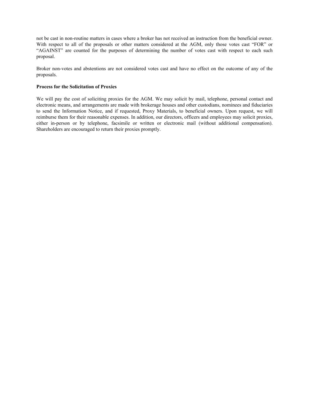 not be cast in non-routine matters in cases where a broker has not received an instruction from the beneficial owner. With respect to all of the proposals or other matters considered at the AGM, only those votes cast “FOR” or “AGAINST” are counted for the purposes of determining the number of votes cast with respect to each such proposal. Broker non-votes and abstentions are not considered votes cast and have no effect on the outcome of any of the proposals. Process for the Solicitation of Proxies We will pay the cost of soliciting proxies for the AGM. We may solicit by mail, telephone, personal contact and electronic means, and arrangements are made with brokerage houses and other custodians, nominees and fiduciaries to send the Information Notice, and if requested, Proxy Materials, to beneficial owners. Upon request, we will reimburse them for their reasonable expenses. In addition, our directors, officers and employees may solicit proxies, either in-person or by telephone, facsimile or written or electronic mail (without additional compensation). Shareholders are encouraged to return their proxies promptly.