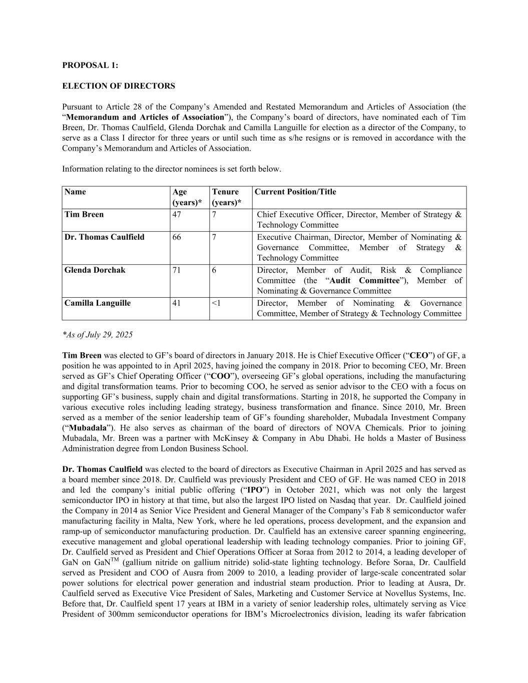 PROPOSAL 1: ELECTION OF DIRECTORS Pursuant to Article 28 of the Company’s Amended and Restated Memorandum and Articles of Association (the “Memorandum and Articles of Association”), the Company’s board of directors, have nominated each of Tim Breen, Dr. Thomas Caulfield, Glenda Dorchak and Camilla Languille for election as a director of the Company, to serve as a Class I director for three years or until such time as s/he resigns or is removed in accordance with the Company’s Memorandum and Articles of Association. Information relating to the director nominees is set forth below. Name Age (years)* Tenure (years)* Current Position/Title Tim Breen 47 7 Chief Executive Officer, Director, Member of Strategy & Technology Committee Dr. Thomas Caulfield 66 7 Executive Chairman, Director, Member of Nominating & Governance Committee, Member of Strategy & Technology Committee Glenda Dorchak 71 6 Director, Member of Audit, Risk & Compliance Committee (the “Audit Committee”), Member of Nominating & Governance Committee Camilla Languille 41 <1 Director, Member of Nominating & Governance Committee, Member of Strategy & Technology Committee *As of July 29, 2025 Tim Breen was elected to GF’s board of directors in January 2018. He is Chief Executive Officer (“CEO”) of GF, a position he was appointed to in April 2025, having joined the company in 2018. Prior to becoming CEO, Mr. Breen served as GF’s Chief Operating Officer (“COO”), overseeing GF’s global operations, including the manufacturing and digital transformation teams. Prior to becoming COO, he served as senior advisor to the CEO with a focus on supporting GF’s business, supply chain and digital transformations. Starting in 2018, he supported the Company in various executive roles including leading strategy, business transformation and finance. Since 2010, Mr. Breen served as a member of the senior leadership team of GF’s founding shareholder, Mubadala Investment Company (“Mubadala”). He also serves as chairman of the board of directors of NOVA Chemicals. Prior to joining Mubadala, Mr. Breen was a partner with McKinsey & Company in Abu Dhabi. He holds a Master of Business Administration degree from London Business School. Dr. Thomas Caulfield was elected to the board of directors as Executive Chairman in April 2025 and has served as a board member since 2018. Dr. Caulfield was previously President and CEO of GF. He was named CEO in 2018 and led the company’s initial public offering (“IPO”) in October 2021, which was not only the largest semiconductor IPO in history at that time, but also the largest IPO listed on Nasdaq that year. Dr. Caulfield joined the Company in 2014 as Senior Vice President and General Manager of the Company’s Fab 8 semiconductor wafer manufacturing facility in Malta, New York, where he led operations, process development, and the expansion and ramp-up of semiconductor manufacturing production. Dr. Caulfield has an extensive career spanning engineering, executive management and global operational leadership with leading technology companies. Prior to joining GF, Dr. Caulfield served as President and Chief Operations Officer at Soraa from 2012 to 2014, a leading developer of GaN on GaNTM (gallium nitride on gallium nitride) solid-state lighting technology. Before Soraa, Dr. Caulfield served as President and COO of Ausra from 2009 to 2010, a leading provider of large-scale concentrated solar power solutions for electrical power generation and industrial steam production. Prior to leading at Ausra, Dr. Caulfield served as Executive Vice President of Sales, Marketing and Customer Service at Novellus Systems, Inc. Before that, Dr. Caulfield spent 17 years at IBM in a variety of senior leadership roles, ultimately serving as Vice President of 300mm semiconductor operations for IBM’s Microelectronics division, leading its wafer fabrication