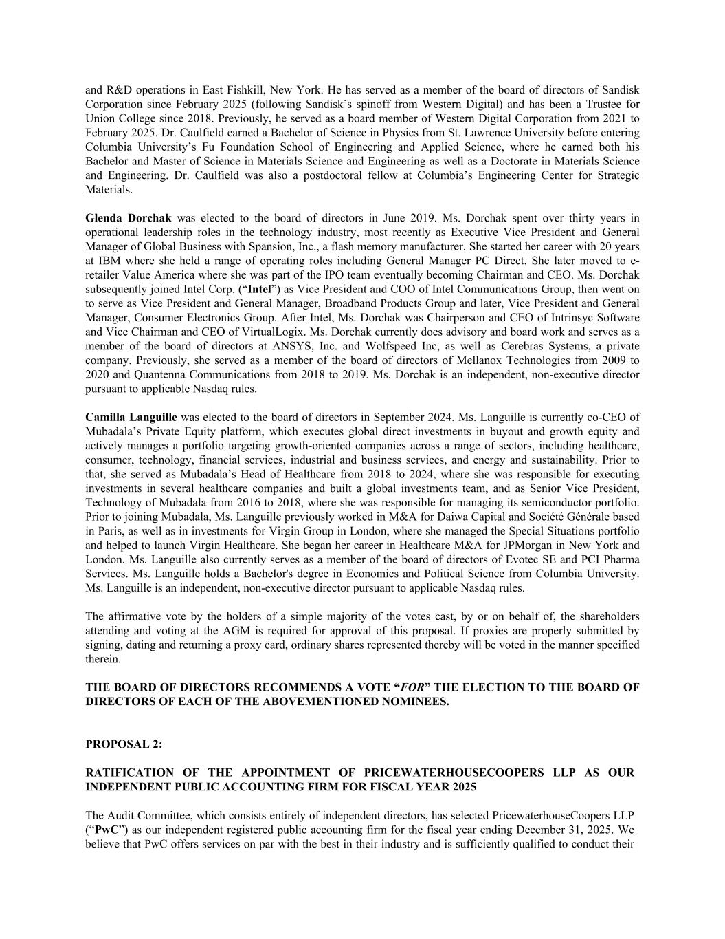 and R&D operations in East Fishkill, New York. He has served as a member of the board of directors of Sandisk Corporation since February 2025 (following Sandisk’s spinoff from Western Digital) and has been a Trustee for Union College since 2018. Previously, he served as a board member of Western Digital Corporation from 2021 to February 2025. Dr. Caulfield earned a Bachelor of Science in Physics from St. Lawrence University before entering Columbia University’s Fu Foundation School of Engineering and Applied Science, where he earned both his Bachelor and Master of Science in Materials Science and Engineering as well as a Doctorate in Materials Science and Engineering. Dr. Caulfield was also a postdoctoral fellow at Columbia’s Engineering Center for Strategic Materials. Glenda Dorchak was elected to the board of directors in June 2019. Ms. Dorchak spent over thirty years in operational leadership roles in the technology industry, most recently as Executive Vice President and General Manager of Global Business with Spansion, Inc., a flash memory manufacturer. She started her career with 20 years at IBM where she held a range of operating roles including General Manager PC Direct. She later moved to e- retailer Value America where she was part of the IPO team eventually becoming Chairman and CEO. Ms. Dorchak subsequently joined Intel Corp. (“Intel”) as Vice President and COO of Intel Communications Group, then went on to serve as Vice President and General Manager, Broadband Products Group and later, Vice President and General Manager, Consumer Electronics Group. After Intel, Ms. Dorchak was Chairperson and CEO of Intrinsyc Software and Vice Chairman and CEO of VirtualLogix. Ms. Dorchak currently does advisory and board work and serves as a member of the board of directors at ANSYS, Inc. and Wolfspeed Inc, as well as Cerebras Systems, a private company. Previously, she served as a member of the board of directors of Mellanox Technologies from 2009 to 2020 and Quantenna Communications from 2018 to 2019. Ms. Dorchak is an independent, non-executive director pursuant to applicable Nasdaq rules. Camilla Languille was elected to the board of directors in September 2024. Ms. Languille is currently co-CEO of Mubadala’s Private Equity platform, which executes global direct investments in buyout and growth equity and actively manages a portfolio targeting growth-oriented companies across a range of sectors, including healthcare, consumer, technology, financial services, industrial and business services, and energy and sustainability. Prior to that, she served as Mubadala’s Head of Healthcare from 2018 to 2024, where she was responsible for executing investments in several healthcare companies and built a global investments team, and as Senior Vice President, Technology of Mubadala from 2016 to 2018, where she was responsible for managing its semiconductor portfolio. Prior to joining Mubadala, Ms. Languille previously worked in M&A for Daiwa Capital and Société Générale based in Paris, as well as in investments for Virgin Group in London, where she managed the Special Situations portfolio and helped to launch Virgin Healthcare. She began her career in Healthcare M&A for JPMorgan in New York and London. Ms. Languille also currently serves as a member of the board of directors of Evotec SE and PCI Pharma Services. Ms. Languille holds a Bachelor's degree in Economics and Political Science from Columbia University. Ms. Languille is an independent, non-executive director pursuant to applicable Nasdaq rules. The affirmative vote by the holders of a simple majority of the votes cast, by or on behalf of, the shareholders attending and voting at the AGM is required for approval of this proposal. If proxies are properly submitted by signing, dating and returning a proxy card, ordinary shares represented thereby will be voted in the manner specified therein. THE BOARD OF DIRECTORS RECOMMENDS A VOTE “FOR” THE ELECTION TO THE BOARD OF DIRECTORS OF EACH OF THE ABOVEMENTIONED NOMINEES. PROPOSAL 2: RATIFICATION OF THE APPOINTMENT OF PRICEWATERHOUSECOOPERS LLP AS OUR INDEPENDENT PUBLIC ACCOUNTING FIRM FOR FISCAL YEAR 2025 The Audit Committee, which consists entirely of independent directors, has selected PricewaterhouseCoopers LLP (“PwC”) as our independent registered public accounting firm for the fiscal year ending December 31, 2025. We believe that PwC offers services on par with the best in their industry and is sufficiently qualified to conduct their