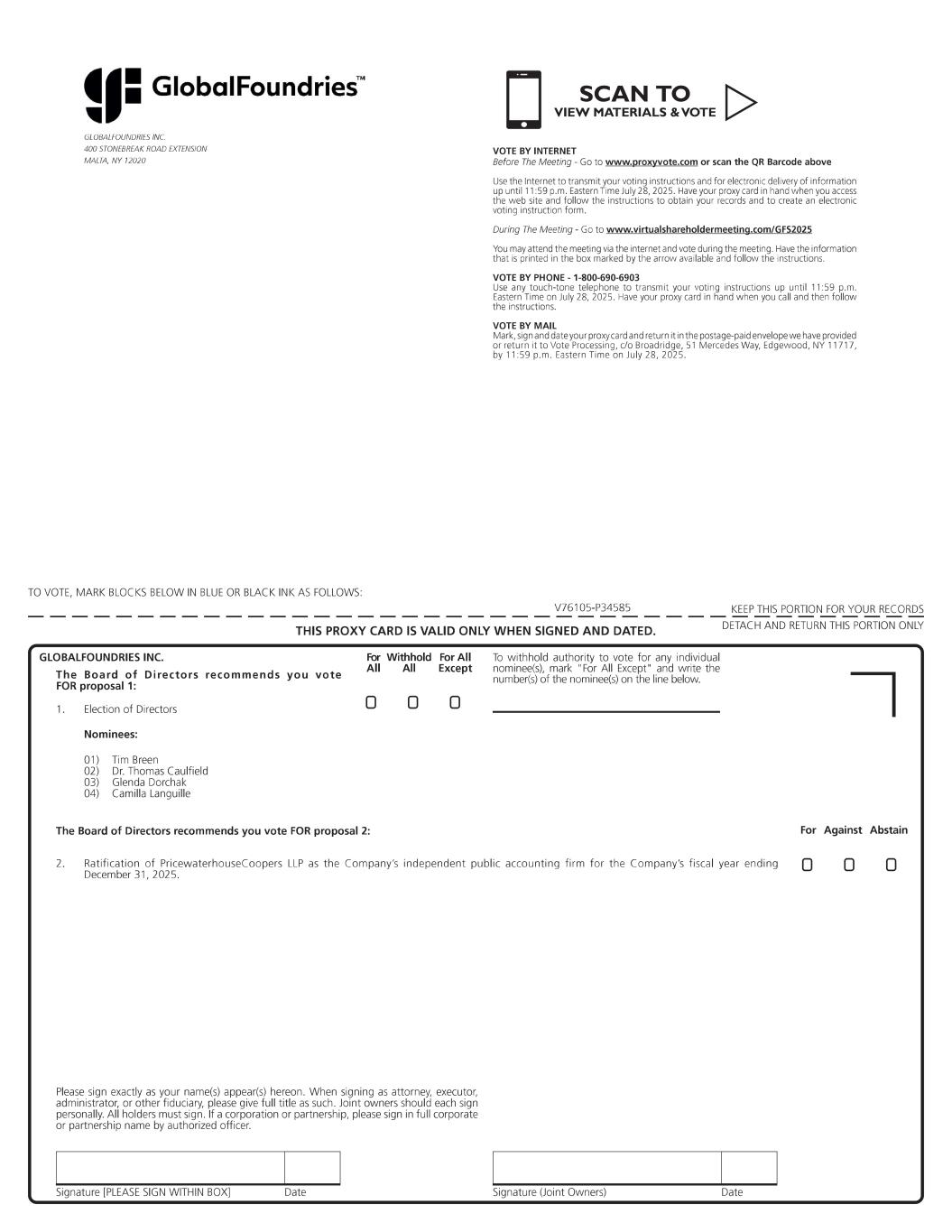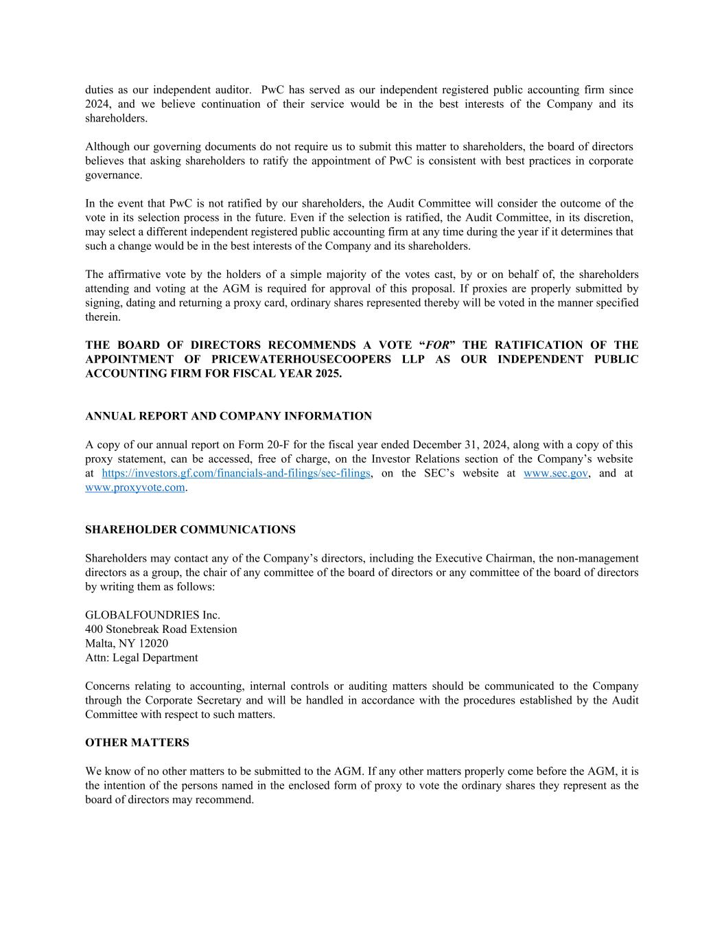 duties as our independent auditor. PwC has served as our independent registered public accounting firm since 2024, and we believe continuation of their service would be in the best interests of the Company and its shareholders. Although our governing documents do not require us to submit this matter to shareholders, the board of directors believes that asking shareholders to ratify the appointment of PwC is consistent with best practices in corporate governance. In the event that PwC is not ratified by our shareholders, the Audit Committee will consider the outcome of the vote in its selection process in the future. Even if the selection is ratified, the Audit Committee, in its discretion, may select a different independent registered public accounting firm at any time during the year if it determines that such a change would be in the best interests of the Company and its shareholders. The affirmative vote by the holders of a simple majority of the votes cast, by or on behalf of, the shareholders attending and voting at the AGM is required for approval of this proposal. If proxies are properly submitted by signing, dating and returning a proxy card, ordinary shares represented thereby will be voted in the manner specified therein. THE BOARD OF DIRECTORS RECOMMENDS A VOTE “FOR” THE RATIFICATION OF THE APPOINTMENT OF PRICEWATERHOUSECOOPERS LLP AS OUR INDEPENDENT PUBLIC ACCOUNTING FIRM FOR FISCAL YEAR 2025. ANNUAL REPORT AND COMPANY INFORMATION A copy of our annual report on Form 20-F for the fiscal year ended December 31, 2024, along with a copy of this proxy statement, can be accessed, free of charge, on the Investor Relations section of the Company’s website at https://investors.gf.com/financials-and-filings/sec-filings, on the SEC’s website at www.sec.gov, and at www.proxyvote.com. SHAREHOLDER COMMUNICATIONS Shareholders may contact any of the Company’s directors, including the Executive Chairman, the non-management directors as a group, the chair of any committee of the board of directors or any committee of the board of directors by writing them as follows: GLOBALFOUNDRIES Inc. 400 Stonebreak Road Extension Malta, NY 12020 Attn: Legal Department Concerns relating to accounting, internal controls or auditing matters should be communicated to the Company through the Corporate Secretary and will be handled in accordance with the procedures established by the Audit Committee with respect to such matters. OTHER MATTERS We know of no other matters to be submitted to the AGM. If any other matters properly come before the AGM, it is the intention of the persons named in the enclosed form of proxy to vote the ordinary shares they represent as the board of directors may recommend.