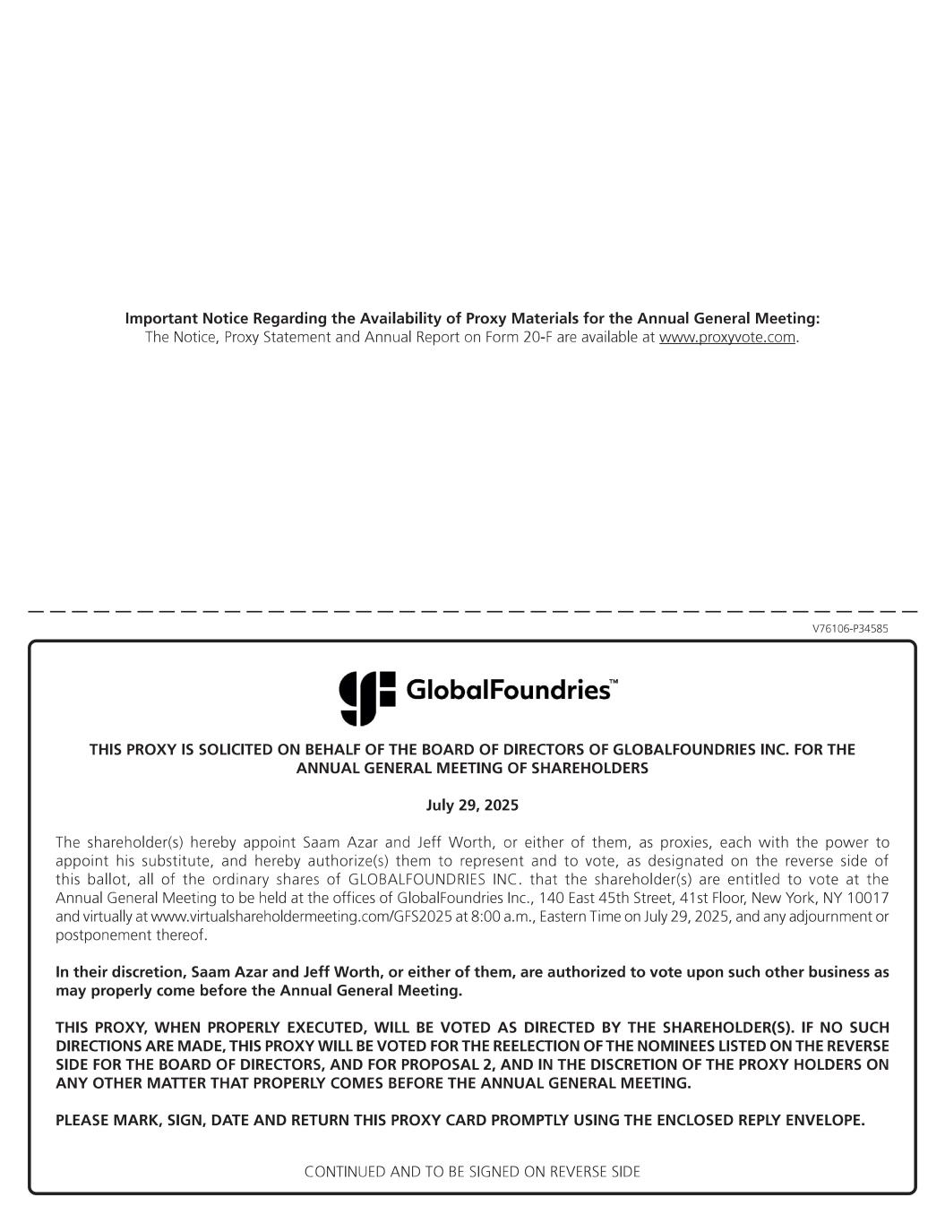 GLOBALFOUNDRIES Inc. 400 Stonebreak Road Extension Malta, NY 12020 PROXY STATEMENT General The board of directors of GLOBALFOUNDRIES Inc. (the “Company” or “we” or “GF”) is soliciting proxies for the annual general meeting of shareholders (the “AGM”) of the Company to be held on July 29, 2025, at 8:00 a.m., Eastern time. The AGM will be held at the offices of the Company at 140 East 45th Street, 41st Floor, New York, New York 10017, and virtually at: www.virtualshareholdermeeting.com/GFS2025. This proxy statement and our annual report on Form 20-F for the fiscal year ended December 31, 2024, can be accessed, free of charge, on the Investor Relations section of the Company’s website at https://investors.gf.com/ financials-and-filings/sec-filings, on the SEC’s website at www.sec.gov, and at www.proxyvote.com. Information on how to vote in person at the AGM is discussed below. If you plan to attend the AGM in person, please note that attendance will be limited to shareholders as of the close of business on June 6, 2025, Eastern time (the “Record Date”). Each shareholder may be asked to present valid photo identification, such as a driver’s license or passport. Shareholders holding shares in brokerage accounts or by a bank or other nominee may be required to show a brokerage statement or account statement reflecting share ownership as of the Record Date. In order to attend and participate in the AGM virtually, you will need to visit www.virtualshareholdermeeting.com/ GFS2025 and you will be required to enter the 15-digit control number included on your Notice of Internet Availability of Proxy Materials (“Notice of Internet Availability”), on your proxy card (if you received a printed copy of the proxy materials), or on the instructions that accompanied your proxy materials to access the meeting. If you are the beneficial owner of shares held in “street name” (that is, you hold your shares through a broker, bank or other holder of record), you must register in advance to gain access to the AGM and obtain a proxy issued in your name from that holder of record in order to vote your shares or ask questions during the AGM. You may also vote online during the AGM by following the instructions provided on the meeting website during the Annual Meeting. To vote virtually at the meeting, visit www.virtualshareholdermeeting.com/GFS2025 and log in using the aforementioned information. Shareholders will have the opportunity to ask questions at the AGM during designated periods. On or about June 18, 2025, we first mailed to our shareholders a Notice of Internet Availability containing instructions on how to access our proxy materials. The Notice of Internet Availability directs shareholders to a website where they can access our proxy materials, including our proxy statement and our annual report, and view instructions on how to vote via the Internet, mobile device or by proxy card. This process is designed to expedite shareholders’ receipt of proxy materials, lower the cost of the AGM, and help conserve natural resources. If you received a Notice of Internet Availability and would prefer to receive a paper copy of our proxy materials, please follow the instructions included in the Notice of Internet Availability. Record Date, Share Ownership and Quorum